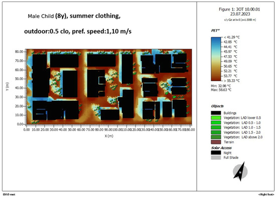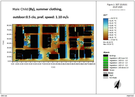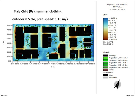 Figure 12. ENVI-met simulation of the area of study. PET 10 a.m., male child 8 years old, summer clothing, 0.5 clo, pref.speed 1.10 m/s.