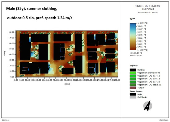 Figure 13. ENVI-met simulation of the area of study. PET 3 p.m., male 35 years old, summer clothing, 0.5 clo, pref.speed 1.34 m/s.