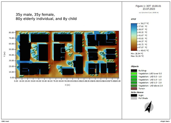 Figure 21. ENVI-met simulation of the area of study. UTCI 10 a.m., male 35 years old, female 35 years old, elderly male 80 years old, and male child 8 years old.