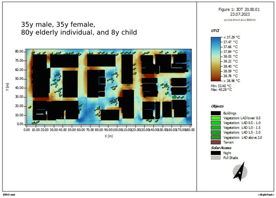 Figure 22. ENVI-met simulation of the area of study. UTCI 3 p.m., male 35 years old, female 35 years old, elderly male 80 years old, and male child 8 years old.