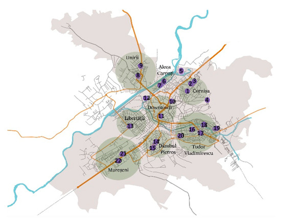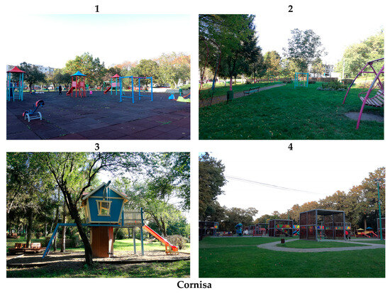 The landscape analysis of playgrounds examined a total of 22 sites distributed across various districts of the city, including the Cornișa district (3), Alea Carpații (3), the city center (3), Unirii district (2), Dâmbu Pietros district (2), Mureșeni (2), Tudor Vladimirescu district (6), Libertății district, and Platoul Cornești (Figure 2).