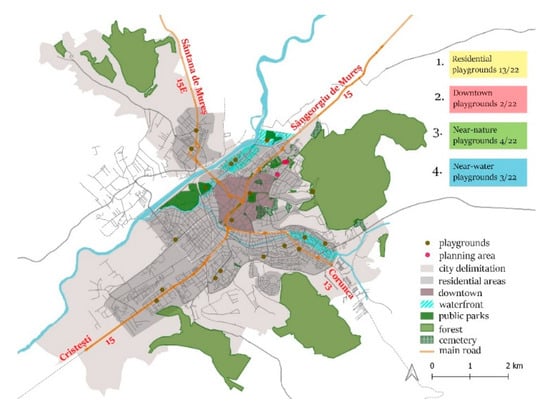 In Târgu-Mureș, the Administration of Public Spaces (ADP—Administrația Domeniului Public) oversees a total of 144 playgrounds, predominantly small to medium-sized areas, with dimensions less than 1 hectare [25]. These playgrounds are situated mainly in residential areas, coupled with small green spaces. The placement of the playground elements has often been haphazard, lacking professional consideration, and in numerous instances, they were set up without proper permissions or architectural planning.