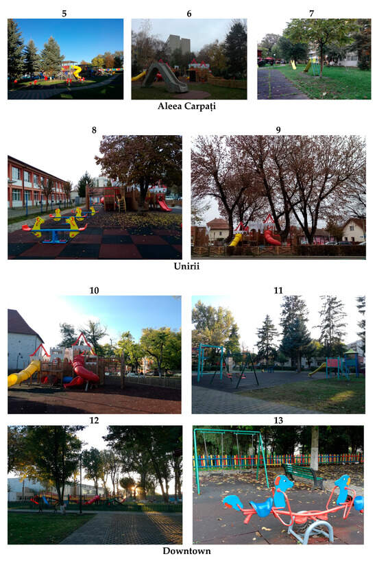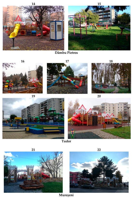 Visual analyses of the existing situation of the inspected playgrounds (1, 2, 3, 4—Cornisa; 5, 6, 7—Aleea Carpați; 8, 9—Unirii; 10, 11, 12, 13—Downtown; 14, 15—Dâmbu Pietros; 16, 17, 18, 19, 20—Tudor; 21, 22—Mureșeni).