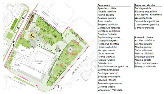 Emphasis was placed on utilizing native or well-adapted plants suited to the urban climate, ensuring a diverse decorative value across seasons and through colors. The vicinity of the playground necessitated avoiding the use of prickly, toxic, or irritating plants. Those are not welcome on the site of playgrounds or nearby [28]. Herbaceous plants are exclusively used in the resting zone, potted from spring to early autumn. Most of these aromatic herbs pose no threat or cause no irritation to children and contribute to a pleasant olfactory and visual ambiance while offering unique characteristics and opportunities to improve knowledge about plants as well as to prevent plant blindness.