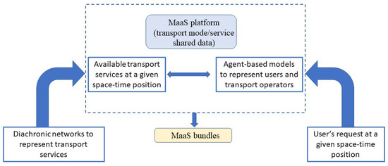 In the above perspective, the goal of this paper, which extends and improves a preliminary study carried out by the authors [11], is to test an agent-based diachronic MaaS simulator to understand the effects of shared travel opportunities on users. Particularly, the effectiveness of an MaaS program lies in its ability to shift users from private transportation modes, such as owned cars, to shared modes/services of transportation, such as buses, metros, and car/bike-sharing. In this context, the user’s decision to change his/her travel behavior turns out to be crucial for the development of MaaS. Starting from the hypothesis, confirmed in the literature, that the car-owner user is unlikely to opt for shared travel solutions for commuting trips [12,13], this study aims to analyze under what conditions of congestion in the transportation system the private car user would be inclined to use MaaS solutions. User travel choices depend not only on socio-economic characteristics but also on the characteristics of the transportation supply system, particularly travel time and monetary costs. For shared transportation systems, the total travel time to accomplish a trip between a given origin/destination pair also includes the waiting time to use the service, a very important variable in transportation mode/service choices, and times associated with transferring between one mode/service and the next. In this perspective, in this work MaaS services offered in the platform were explicitly represented to account for waiting and transfer times by using diachronic networks, which allow transport services to be represented in a space-time context. In such a framework, the user can identify the travel solution that, at a given instant, provides the most favorable combination of transportation services for his/her trip.