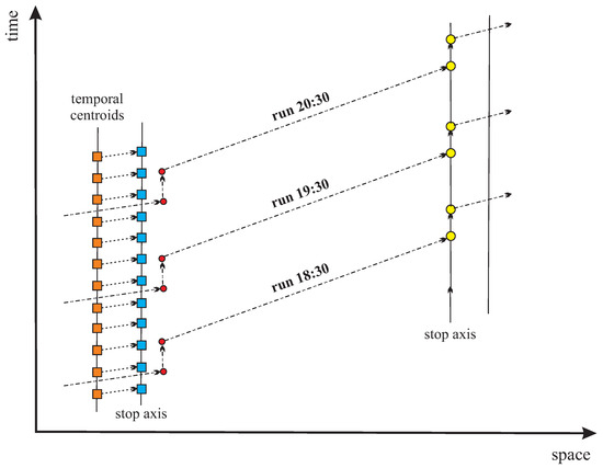 In a DN model, each node has an explicit time coordinate and represents an event that occurs at a given instant. Figure 2 shows an example of DN applied to shared transport services. In the figure, each temporal centroid represents the transportation demand at a given time, while along the stop axis, each node represents the space-time position of the service. As an example, the space position corresponds to the physical stop location, while the time position corresponds to the time the service is available at the stop—e.g., a bus is stopping. Links correspond to the space-time relationship between two nodes, such as travel time to reach the stop or travel time for reaching the parking lot for car-sharing station-based services. Links from the departure stop to the arrival stop represent single runs, which have a space-time representation.