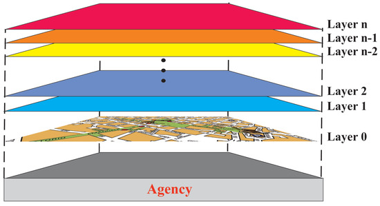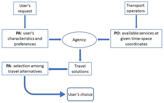 In detail, each user is represented by his/her personal agent (), while each transport operator is associated with its agent (). From a transportation system perspective, s represent transportation demand and s represent the offered transportation supply. The agency is interfaced with both s and s; in other words, it acts as a liaison between them (Figure 3).