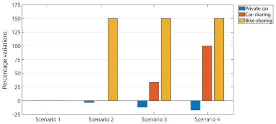 For each simulated user i, the probability that he/she would choose one of the travel solutions provided by the agency has been obtained by Equation (2), where includes both the user’s features as stored in and the relevant characteristics (i.e., time, monetary cost, and so on) of the considered alternatives [46,47], which are multi-layer paths in the simulated environment. Table 2 summarizes the results. Figure 5 depicts the percentage variations of users’ choices in the four simulated scenarios; particularly, scenario 1, corresponding to free flow conditions, has been considered as a baseline, and changes in the user’s choices in scenarios 2, 3, and 4 have been computed with respect to scenario 1.