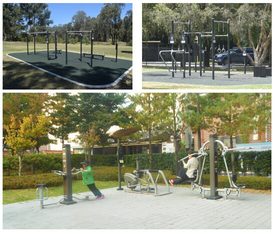 - Jansson, A.K.; Lubans, D.R.; Smith, J.J.; Duncan, M.J.; Haslam, R.; Plotnikoff, R.C. A Systematic Review of Outdoor Gym Use: Current Evidence and Future Directions. J. Sci. Med. Sport. 2019, 22, 1335–1343. [Google Scholar] [CrossRef]