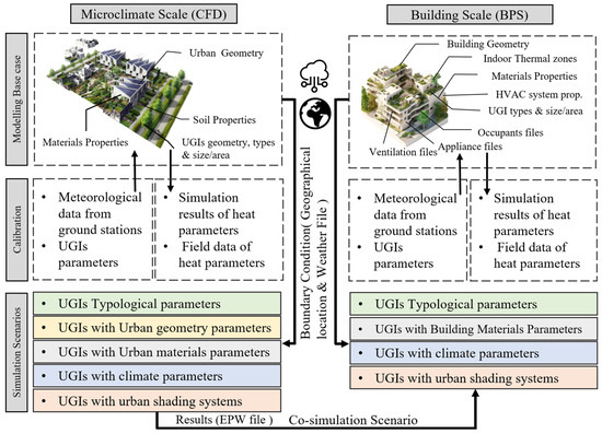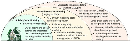 Urban and Building Performance Simulation (UPS and BPS) is a methodology that uses many mathematical models replicating a building or an urban context for performance simulation [52]. The application of fundamental physical and engineering models and simulations is part of the broader domain of scientific computing. These applications can be undertaken mainly on three climatic scales: mesoscale, microclimate scale and building climate scale. Mesoscale urban climate modelling investigates the climate behaviour over urban areas on a medium scale—typically between the street level and regional or larger scales, typically a diameter of 1–100 km. This approach is particularly valuable for understanding how urban environments interact with natural weather and climate processes, as well as the localised impacts of urbanisation on climate [53] (Figure 3). Weather Research and Forecasting (WRF) are widely used models for this climate scale [53]. One of the benefits of this scale modelling is the ability to calculate large green spots within the modelled area [49], yet it lacks the capability of calculating the shading effects of UGIs under the canopy layers. On the urban canopy scale (a diameter of 1–1000 m), microclimate simulation models are used for the UGIs’ efficiency measurement, which are small-scale climate models impacted by site morphology, topography, and materials [49]. They can be either the Urban Canopy Model (UCM) or Computational Fluid Dynamic (CFD) models [49] (Figure 3). The first one referred to the urban climate models designed to simulate the energy balance, temperature, and other meteorological variables within urban environments and the later one refers to a set of numerical methods and algorithms used to simulate the detailed motion and interaction of fluids/air with surfaces in a given environment [49]. However, they are both modelling approaches used in urban climate studies, including UGI studies, but they serve different purposes and offer different levels of detail. Since UGIs affect the energy consumption of buildings, Building Energy Models (BEM) tools continue to improve and include calculation of the UGI’s effect on the building’s indoor performance. Various simulation models exist, such as linear and nonlinear, deterministic or stochastic, and static or dynamic [52]. However, they lack the ability to calculate UGIs evapotranspiration or limitedly calculate that (Figure 3).