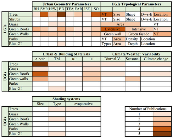 Researchers have conducted various simulation scenarios to assess the quality of UGIs. Different parameters combined with UGIs have been simulated to evaluate UGI’s performance in heat mitigation. Figure 5 presents the simulated types of UGIs among the articles with other parameters affecting heat mitigation. It is obvious that trees are the most simulated types of UGI, especially with building density, sky view factor, and albedo materials. It is followed by green roofs and green walls, particularly green roof types with urban albedo materials and vegetation types. Parks, Blue-GI, and Shrubs are the least simulated UGIs (Figure 5).