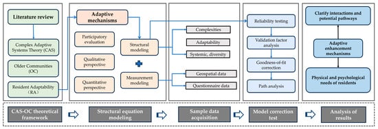 This study constructs a complex adaptive system for old residential communities based on Complex Adaptive System (CAS) theory to validate the mechanisms influencing resident adaptability. The research unfolds via the following five steps: (1) Summarize existing research and systematically deconstruct old residential communities based on CAS theory to define the connotations and characteristics of resident adaptability. (2) Combine qualitative and quantitative perspectives to hypothesize influence mechanisms and construct structural and measurement models. (3) Use the hedonic pricing model and probability-proportional-to-size sampling method to select sample communities, and collect and process relevant geographic spatial data and survey questionnaire data. (4) Conduct data analysis, model modification, and testing to examine the influence paths and identify the mechanisms affecting resident adaptability. (5) Develop strategies to enhance resident adaptability, providing more systematic renewal ideas to address adaptability challenges and promote the sustainable development of old residential communities (Figure 1).