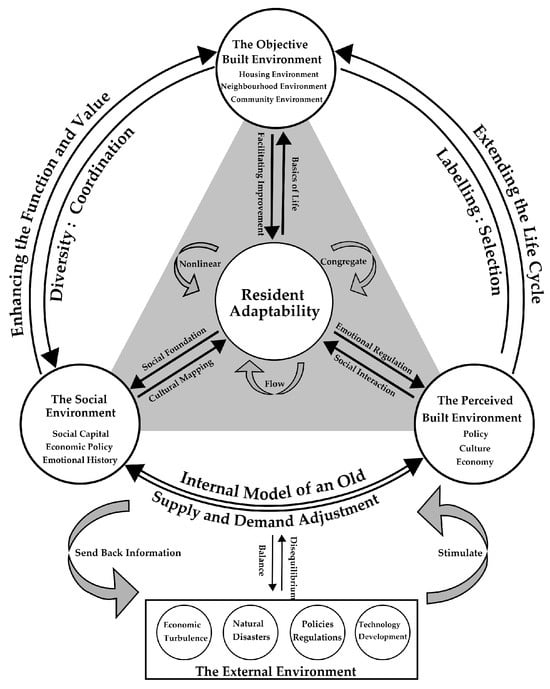 The process of urbanization is accelerating globally. According to the United Nations Department of Economic and Social Affairs’ World Urbanization Prospects 2024, more than half of the world’s population, equivalent to 3.9 billion people, currently lives in urban areas. An additional 2.5 billion people are expected to reside in cities and towns by 2050 [1]. The urban system is becoming unbalanced due to the interaction of external environmental stimuli, such as natural disasters, and the gradual accumulation of pressures like environmental degradation [2]. The socioeconomic environment of cities interacts with individual factors to influence resident adaptability in complex ways. Theoretically, a higher adaptive capacity among residents can maximize the overall adaptability of the system. However, in reality, residents face not only economic and social resource pressures but also uncertainties relating to factors such as social identity and policy support. These factors lead to physiological and psychological maladaptation, which has gradually become one of the most prominent and complex issues in urban areas. Enhancing resident adaptability has become a critical priority, shifting the focus to proactive adaptive measures to address challenges posed by changes in internal and external environments. Research by the International Resilience Alliance further confirms that enhancing the adaptive capacity of individuals not only enables them to cope with environmental and social changes but also helps maintain their functioning and level of service when the system is exposed to external shocks [3]. The theory and practice of resident adaptability research continue to attract attention. Resident adaptability is understood as the ability of residents to adjust and change their cognition, behavior, and psychology in response to external environmental and social role changes in combination with pre-existing resources [4]. In particular, in the face of climate change, resource scarcity, and uncertainties in urban development, resident adaptive capacity has become a key factor in alleviating environmental stress and improving quality of life. Scholars from various disciplines have explored how individuals respond to environmental changes by adjusting their behavior and cognition [5,6]. Adaptation is often discussed in the context of how residents cope with climate change, resource management, and environmental risks [7,8], for example, in the study analyzing climate adaptive features in traditional buildings to guide building design and retrofitting, or is related to matching issues such as socioeconomic changes and policy adjustments [9,10]. In recent years, the research focus has shifted from macro-level social and ecological systems to micro-level behaviors and community interactions [11]. Researchers have begun to examine the resident adaptation at the individual and community levels [12]. For instance, numerous studies on rural residents and small, unique towns have explored adaptation strategies under varying environmental conditions [13,14]. Some studies have investigated the relationship between community environments and resident adaptive behaviors in old communities. It focuses on the effects of neighborhood and environmental factors on community satisfaction of older adults and explores the differences in the needs of different residents for community services and the types of community services [15,16]. These studies confirm the diversity and complexity of the mechanisms underlying residents’ adaptive behavior. However, most current research focuses on analyzing residents’ psychological perceptions without fully integrating multi-dimensional behaviors into a systematic study. Additionally, many studies concentrate solely on the relationship between residents’ behavior and objective environmental factors, lacking a comprehensive analysis that includes economic policies, social capital, and other aspects. The evaluation systems and mechanisms of action still lack systematic and theoretical support. Scientific descriptions of the interactions between subjects and their mechanisms of action remain unclear, necessitating further exploration through practical and case studies.