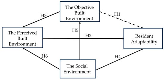 This study integrates subjective and objective evaluations of three dimensions of neighborhood attributes—the perceived built environment, objective built environment, and social environment—to explore their relationship with resident adaptability. A structural relationship hypothesis model is constructed (Figure 3).