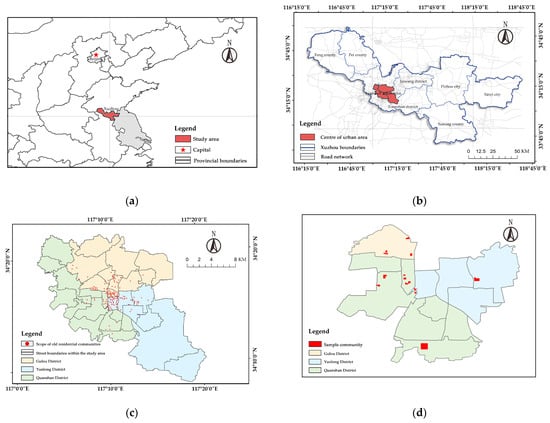 Study area and research plots; the geographic location of Xuzhou City in China (a); geographic location of the central urban area (b); the distribution of the 489 old communities in the central urban area (c); and the distribution of the locations of the 15 sample communities in this study (d).