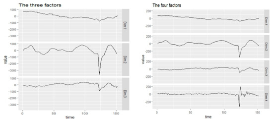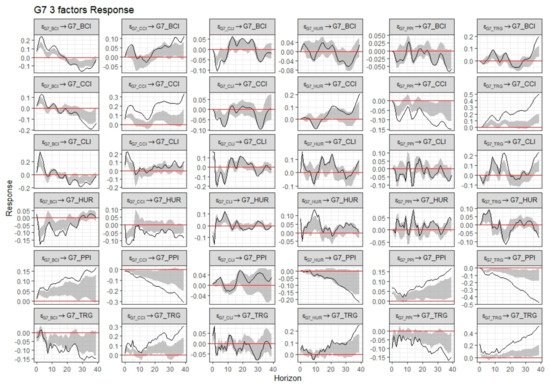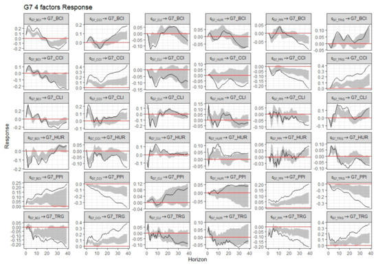 Figure 3, Figure 4, Figure 5, Figure 6 and Figure 7 provide a visual representation of the impulse response functions (IRFs) and variable responses in the FAVAR model, facilitating a more detailed comparison of the results. Figure 3 depicts the trends of the three and four factors, revealing the adverse effects of the 2020 COVID-19 pandemic and marked by a deep V shape occurring from January to June 2020 in the second factor.