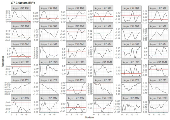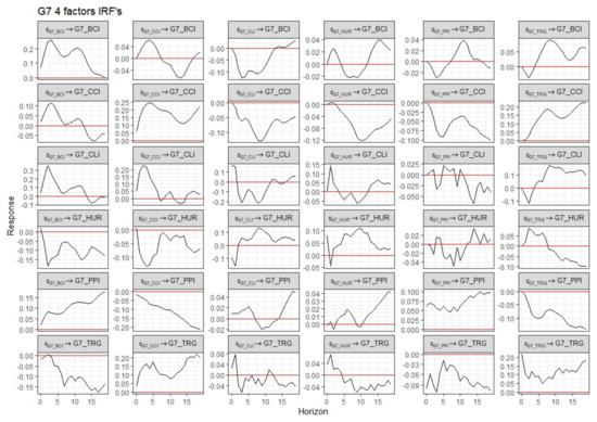 As it can be observed, the relationship between variables is not changed greatly between three- and four-factor IRFs with only minor changes in magnitude, which accurately depicts the dynamic relationships that exist [18]. For instance, a significant increase in PPI can signal rising manufacturing costs, which in turn, can lead to higher prices, potentially influencing demand. Meanwhile, a high BCI can sometimes result in increased production, which can increase demand for raw materials, potentially increasing producer prices and impacting the PPI.