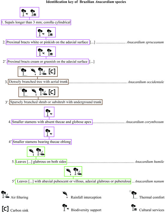 Short identification key of Brazilian Anacardium (cashew-nut) species (English version) [136], illustrating the association between some morphological characters and ecosystem services. Brown boxes represent plant life form and size characters, green boxes represent leaf characters, and pink boxes represent reproductive characters.