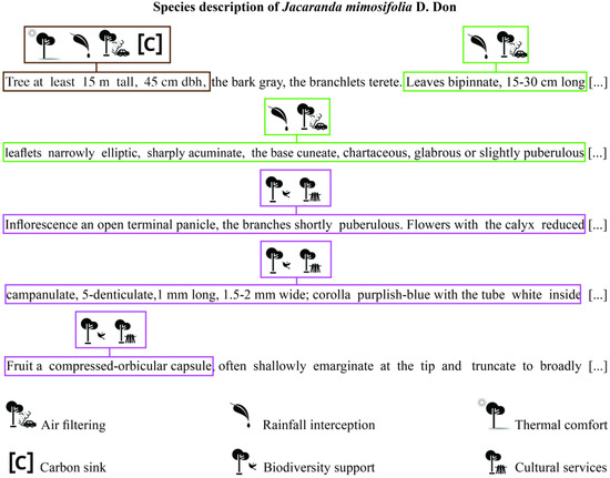 Brief Jacaranda mimosifolia description [132] illustrating the association between some morphological characters and ecosystem services. Brown boxes represent plant life form and size characters, green boxes represent leaf characters, and pink boxes represent reproductive characters.