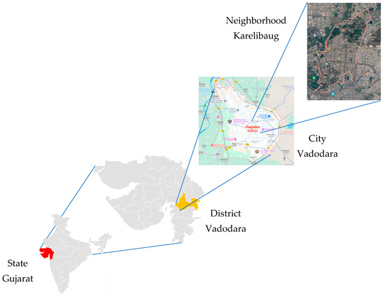 The study area as shown in Figure 1 is located in Vadodara, a city in western India that is part of the Vadodara district (7548.50 Sq km area) at coordinates 22.30° N and 73.19° E. It has an elevation of 39 m (123 feet). Vadodara, a city in Gujarat, has an area of 149 square kilometers, making it the 18th biggest city in India and the third biggest city in the state. Vadodara’s temperature fluctuates from 7 °C in winter to 44 °C in summer, with an average annual rainfall of about 625 mm. The city has a simple and rolling landscape [43], a population of 1,741,791 according to the 2011 census [44]. Based on census statistics over the last three decades, it can be seen that the city of Vadodara is experiencing significant and fast growth. Based on the 2001 census data, the population of Vadodara was recorded at 1,491,045, showing a growth rate of 32.30% compared with the population in 1991. In 2011, the growth rate significantly increased by 6.2%, and the population 2011 reached 1,741,791 [44]. The combined length of arterial, sub-arterial, collector, and other roads in the VMC (Vadodara Municipal Corporation) area is roughly 1000 km. These roads cover approximately 11.5 square kilometers of land, constituting approximately 11% of the total area [11]. Vadodara is classified as a Tier II city due to its moderate economic growth, expanding industrial base, and improving infrastructure in sectors like education, healthcare, and transport. While it offers a lower cost of living and growing job opportunities, it lacks the international connectivity and financial prominence of Tier I cities, making it an appealing choice for businesses and professionals seeking a balance between development and quality of life [45,46]. As the city’s population and land use change, all infrastructural development occurs quickly. The road’s physical infrastructure has improved, allowing access to all new development areas. In urban areas, motorbikes and motorcycles usually account for about 50–60% of the overall traffic, while cars represent a smaller proportion, ranging from 6% to 15%. Autorickshaws, a kind of para-transit mode, make up between 5% and 20% of the overall transportation options, whereas buses account for roughly 1–4%. Over the years, the number of para-transit vehicles in the city has consistently increased, reaching over 35,000 automobiles and taxis. This number grows yearly at a rate of 2.85% [11]. The rise in private automobiles contrasts with the decline of sustainable modes like walking, cycling, and public transit. This shift leads to congestion, pollution, and accidents, deteriorating urban life. Mitigating these issues is crucial for sustainable urban development and residents’ well-being, necessitating prioritization of sustainable transportation options. This research focuses on the Karelibaug neighborhood, a vital component of Vadodara’s developing urban fabric. Selected to reflect the city’s infrastructural advancements, Karelibaug is situated within ward No.8 (an administrative division within the city), nestled amidst the historic districts of Vadodara. This study delves into the dynamics of this specific area to assess its unique characteristics and contribute valuable insights into its infrastructural progress and urban development. While predominantly residential, the area also features mixed land use, adding diversity to its urban fabric. Despite rising private vehicle use challenges impacting congestion and pollution, Karelibaug requires a nuanced approach to address unique mobility and sustainability needs. Strategic measures emphasizing sustainable transportation modes could enhance livability in Karelibaug by addressing its distinct mixed land use dynamics.