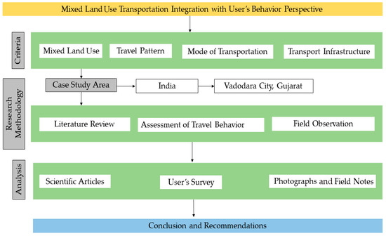 The study conceptual framework of the research is shown in Figure 2. In the initial phase of the research methodology, a systematic approach was employed to identify the relevant literature about the study’s focus on travel patterns, user behavior, and mixed land use in urban environments. Leveraging digital platforms such as Google Scholar, comprehensive searches were conducted using a set of predefined keywords, including “travel pattern”, “user behavior”, “Tier II cities”, and “mixed land use”. This process yielded diverse journal articles, research papers, and relevant publications. Subsequently, the identified studies underwent a thorough review, wherein each was meticulously examined, summarized, and synthesized. Key concepts, trends, and gaps in understanding were extracted to discern the intricate relationship between mixed land use, user behavior, and transportation challenges. This synthesis generated common themes and patterns, offering valuable insights into urban transportation planning dynamics in Tier II cities like Vadodara. Identifying these themes informed the research objectives and provided a conceptual framework for subsequent data collection and analysis. This methodological approach ensured a comprehensive understanding of existing knowledge, facilitating the development of research questions and hypotheses to guide the remainder of the study.