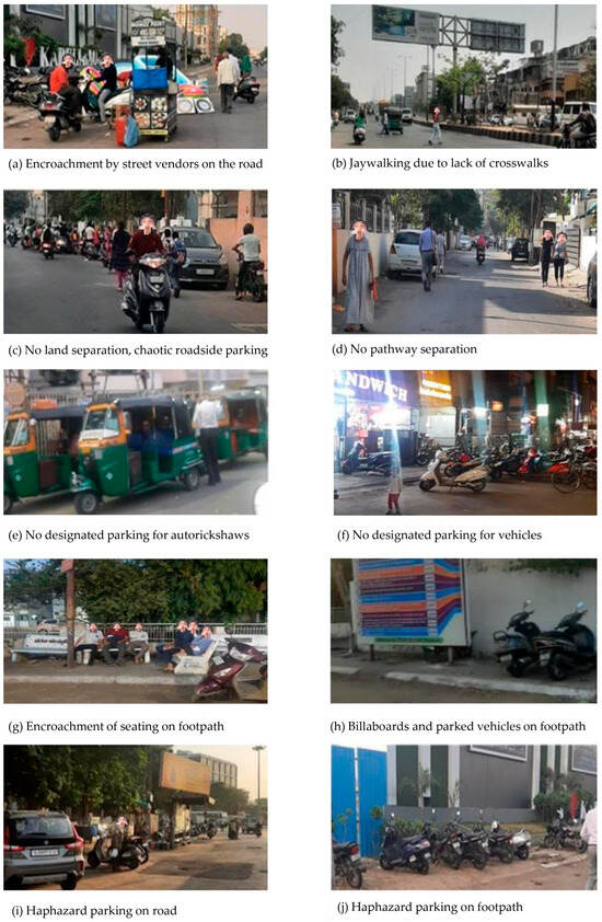 Field observations conducted in the Karelibaug area were essential to understand the local transportation infrastructure and usage patterns comprehensively. The observations revealed several critical issues impacting pedestrian safety and overall traffic flow. At first, there was a significant decrease in the number of people using footpaths, primarily due to problems with people occupying the footpaths. Unlawful structures like billboards, benches, and street sellers hindered pedestrian access on sidewalks, forcing pedestrians to move through vehicular traffic on the road and increasing the likelihood of accidents (Figure 4a,g,h).