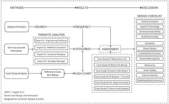 The study presented in this paper is explicitly framed within the above mentioned SDG11 targets 11.3, 11.5, and 11.7. It is part of a two-year research project funded by the University of the Basque Country and the Basque Government. Started in November 2022, the project is led by the School of Architecture and the School of Engineering of the Basque Country in collaboration with a major manufacturer of street furniture and road elements (Transformados Metálicos S.L.—Trameinsa). The objective of the project is to ‘define novel strategies for the design of the urban street space and its components (e.g., urban furniture) for more sustainable and egalitarian cities’, where ‘sustainable’ refers to technical, economic, cultural, and social sustainability and ‘egalitarian’ highlights the need to grant universal accessibility, inclusivity, and moving towards a more-than-human perspective in urban design. The research actions conducted in this research project are oriented towards delivering tangible design outcomes (e.g., prototypes of novel urban furniture solutions). The present article reports the results of a preliminary phase of this project where we aimed at establishing a research framework grounded in experimental data to serve as a guide for the design of novel solutions in the upcoming phase (currently under development). This project responds to the following research questions: do we need a specific set of tools for the design of urban furniture and public space in the current, largely unprecedented, social, technological and environmental situation? Is there a new or renewed framework of design, both global and local, to work with? Our initial hypothesis is that there is a need for a renewed framework for public spaces design and urban elements (furniture and else) that demand a revisited set of design tools and methods. We intend to confirm this conjectural hypothesis by gathering insights from experts, checking research tendencies and comparing/assessing the success of similar design endeavors over time.