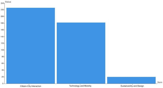 Distribution of three thematic areas based on the keyword analysis: citizen–city interaction is the most relevant area (with 226 entries), followed by technology and mobility (182 entries) and sustainability and design (20 entries).