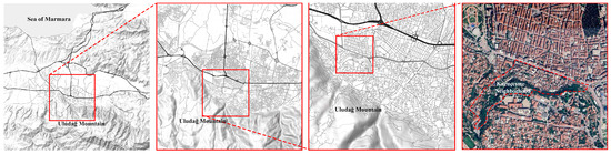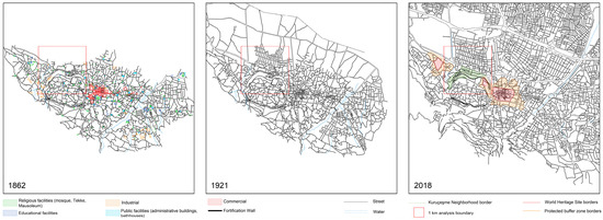 The traditional map of Bursa, as depicted in Figure 5, presents an organic urban structure with a commercial center, including several caravanserais. The urban development of Ottoman cities in the 19th century resulted in the construction of new streets. The maps illustrate the evolution of Bursa’s urban structure at the city level over time. A square with a side length of 1 km, depicted in red on the maps, is used for close examination of the Kuruçeşme Neighborhood.