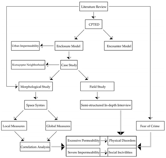 The duality of permeable versus impermeable urban areas has been explored for decades in studies on urban crime. Permeability refers to the ease of movement in different directions for a variety of objectives, hence fostering social interactions, walking, and the vibrancy of urban spaces [1,2,3]. When it comes to safety concerns, permeability could be seen as a threat to the security of urban spaces [4,5,6,7]. CPTED (Crime Prevention Through Environmental Design) proposes two distinct models to modify the physical environment. The first one is the “enclosure model”, which encompasses design strategies to make urban spaces impermeable to reduce crime opportunities [2,8]. On the other hand, the second one is the “encounter model”, which acknowledges permeability as a requirement for maintaining “eyes on streets” as a mechanism of surveillance [1,9,10]. The contradiction between two models of the CPTED comes from different approaches toward the presence of strangers in a neighborhood [11,12,13]. In the enclosure model, regarding the theory of defensible space [4], strangers should be kept out of residential areas because they pose a threat. It aims to strengthen “territoriality” through impermeability, positing that a decrease in strangers enhances the residents’ sense of ownership. In the encounter model, in contrast, strangers are seen as a “natural policing mechanism” that supports neighborhood livability and social interaction [2,9,13]. The ISO 22341:2021 guidelines, which confront the concepts of physical and social CPTED, demonstrate the differentiation between the two models [14]. This study investigates the impact of urban impermeability resulting from physical interventions on “fear of crime” as a social aspect of urban safety. How does urban impermeability influence individuals’ perception of safety in a neighborhood? The primary hypothesis of the present study asserts that access constraints lead to the exclusion of reputable strangers in a neighborhood and the reduction of natural surveillance. Consequently, they foster an environment possessed by illegitimate users that evokes fear of crime.
