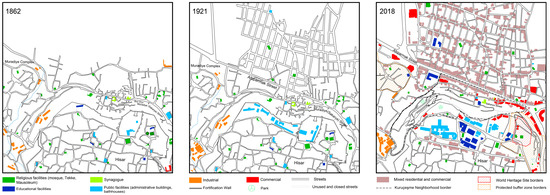 Two main research methods are applied in this study: urban morphology, including the quantitative techniques of Space Syntax, and field study, comprising observation and semi-structured, in-depth interviews as the qualitative method. Urban morphology, as “the systematic study of the form, shape, plan, structure, and functions of the built fabric” [74], is used to examine the changing urban structure of Kuruçeşme. Data are collected through library resources, including historical documents and maps, which are digitized for analysis. Three maps depicting distinct periods of Bursa are analyzed: the 1862 map (traditional Bursa), the 1921 map (the early urban modernization period), and the current map of Bursa. Figure 3 presents two old maps of Bursa. Space Syntax, developed in the 1980s by Hillier and Hanson [75], is used to evaluate the changing accessibility pattern of Kuruçeşme Neighborhood.