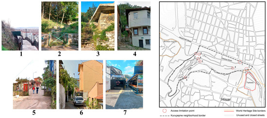 Beginning in the early 2000s, urban interventions were initiated in Kuruçeşme to mitigate rising crime and vandalism. Some alleys were closed using gate doors, and security guard stations were established at multiple locations for official monitoring. After a while, the government removed the stations due to their financial burden. Figure 7 illustrates the locations and photographs of restricted pathways in Kuruçeşme Neighborhood. Certain paths have turned into neglected zones overgrown with foliage, as illustrated in Figure 7, photographs 3 and 4. The gate door of the alley depicted in photograph 5 is no longer locked. A large metal gate door closed the pedestrian walkway that originated from the tourist zone of Tophane and encircled the historic fortification wall (photograph 1 in Figure 7). Sakarya Street, the most important urban axis, has been closed to vehicle traffic and is now partially occupied by fish restaurants and taverns (photograph 7 in Figure 7). Some alleys have been illegally converted into cul-de-sacs by owners using them as private spaces (photograph 6 in Figure 7).