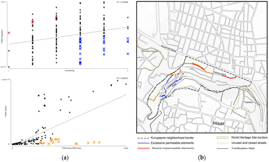 The correlation analyses between local and global measures of Kuruçeşme Neighborhood: (a) the upper scatter plot illustrates the correlation between segment connectivity and global integration (T1024), and the lower scatter plot depicts the correlation between local choice (R500 metric) and global choice (T1024). (b) The elements with high incompatibility, highlighted on the scatter plots in red, blue, and orange colors, are depicted on the map. The red and orange segments on the map exhibit the conditions of “excessive permeability”, while the blue elements indicate “severe impermeability”.