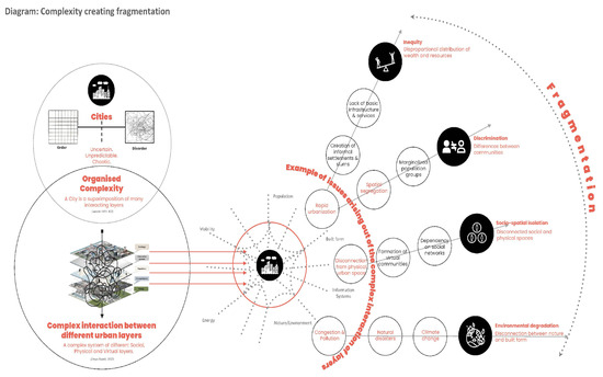 A city is a superimposition of many layers within the social, physical, and virtual dimensions [9]. The interactivity and complexity between these layers make cities active, energized, thriving centers of human interaction [10]. However, cities reveal not only the best but also the worst aspects of humanity—in the form of rapidly degrading urban environments and rampant urban sprawl, inequity, discrimination, violence, etc. [11]. From the planning perspective, cities can be seen as complex organisms with numerous interconnected parts and processes on spatial, social, and economic levels that interact in unpredictable ways. This complexity can be further compounded by various factors, such as rapid urbanization, technological advancements, social changes, and environmental issues, which lead cities to transformation and fragmentation within the urban fabric [12].