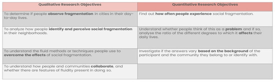 However, the qualitative approach will be employed to explore the problem of fragmentation, focusing on changes in social dynamics within certain areas of a city. For example, in the city of Köln, the city faces spatial fragmentation via the river that separates urban life. We could then identify smaller neighborhoods to analyze the layer of social dynamics. This approach helps us identify the obvious fragmentation but then requires us to delve deeper into understanding the community. Our qualitative research methodology will be used to achieve the following objectives as shown in Figure 5: