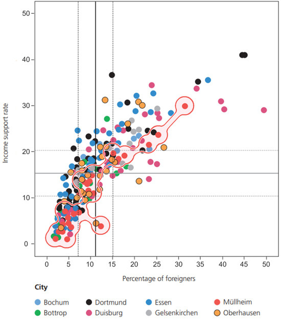 Figure 6. The correlation between social and ethnic segregation in selected Ruhr cities. Scheme 2016. in [44], accessed on the 25 July 2024.