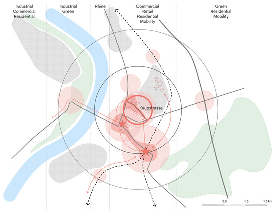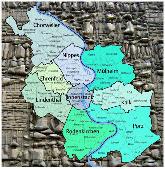 Figure 7. Mülheim neighborhood within its context. Source: https://www.stadt-koeln.de/mediaasset/content/pdf13/stadtteilinformationen_2017.pdf, accessed on 20 September 2023.