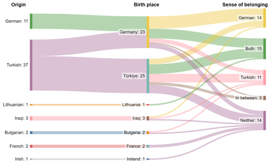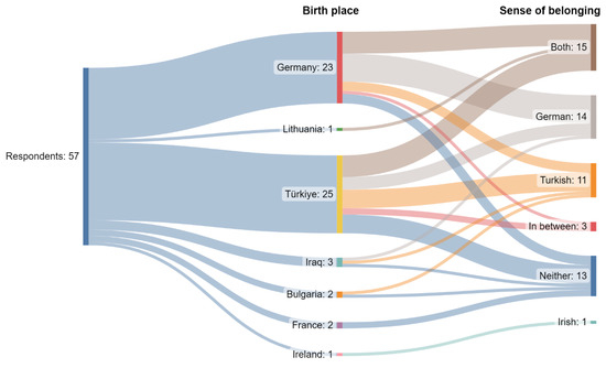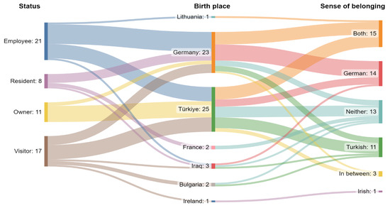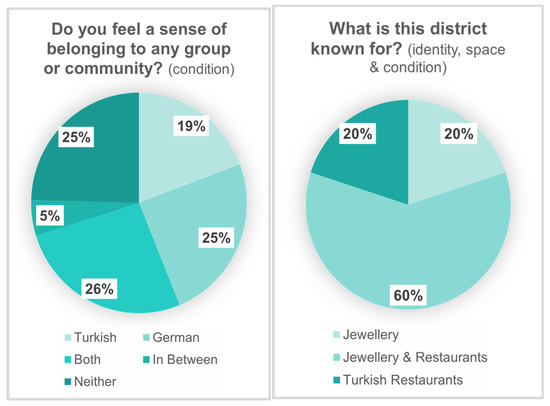 Moreover, it is noticed through Figure 17 that origin has an impact on the sense of belonging; however, even if the origin was Turkey, as in most cases, yet, if they have been residents and working in Germany for quite some time, the sense of belonging would vary and move to either both places or to Germany as the host country, as in Figure 16. This notion of becoming more attached to a place if economic and social stability prevail is important, in thinking forward to how to utilize the space with more diversity and more integration of new economic typologies to different settings. It is thought to be of added value to raise such a sense of belonging on the verge of migrant community settings, and, hence, the expansion of such an impact in other spots in the city.