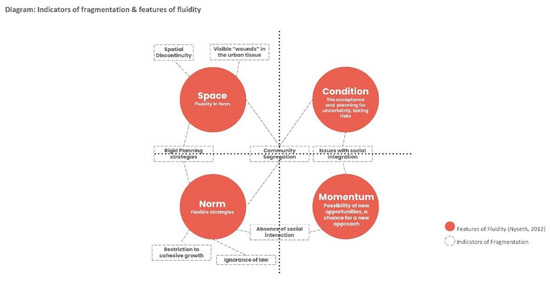 As outlined before, cities experience dynamic urban fragmentation in three major forms: spatial, social, and governmental [34]. Fluidity is the glue that holds a fragmented city together. In the context of planning, Torill Nyseth categorizes fluidity in four forms: space, a planning condition of radical uncertainty, norm, and momentum or potentiality [22], as shown in Figure 3. Each type of fragmentation has several fluid ‘glues’ that make the city work as a comprehensive system.