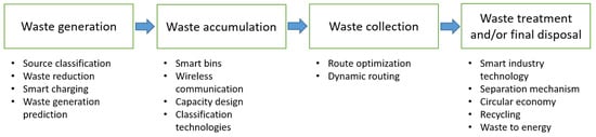 Overall, effective waste management requires combining strategies aimed at reducing waste generation, promoting recycling and reuse, and ensuring safe and environmentally sound disposal practices. It is a complex and multifaceted process that requires cooperation and coordination among governments, businesses, communities, and individuals to achieve a sustainable and efficient outcome. In this regard, modern smart technologies contribute to enhancing the efficiency and sustainability of several stages of waste management.