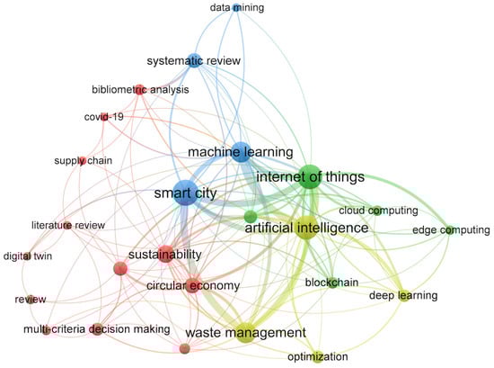 Figure 2 presents a schematic analysis of the main keywords found in the set of analyzed articles conducted using VOSviewer. Only keywords with at least five repetitions were plotted. Prior to the analysis, a meticulous revision was conducted to merge very similar words, e.g., “smart city” and “smart cities” or “waste management” and “solid waste management”, to ensure representative results. Then, the most frequently occurring keywords were “smart city” (48 occurrences), “internet of things” (43), “artificial intelligence” (40), “machine learning” (33), “waste management” (30), “sustainability” (21), “circular economy” (17), “systematic review” (15), “industry 4.0” (14), “big data” (12), “optimization” and “multi-criteria decision” (both 10), and “deep learning” (9).
