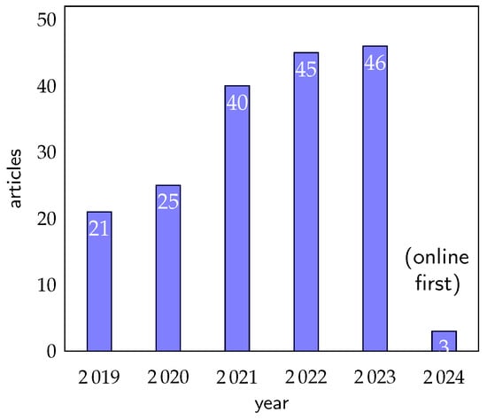 Figure 3 presents the number of articles published per year. A clear increasing trend is shown, with the number of articles rising steadily from 21 in 2019, 25 in 2020, 40 in 2021, 45 in 2022, and reaching a peak of 46 in 2023. The seven articles in 2024 include those first published online in 2023 and subsequently included in the 2024 volumes of the journals.