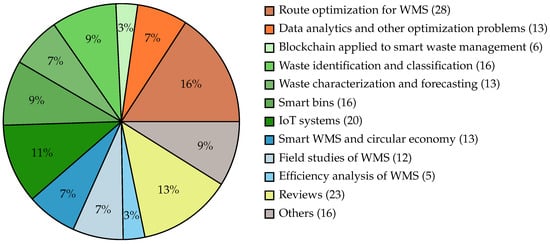 From the total number of 180 articles reviewed, 13% were reviews. Among the application articles, the majority were focused on route optimization for WMS (15%), reviews (13%), and IoT systems (11%). Other relevant topics included waste identification and classification (9%), smart bins (9%), waste characterization and forecasting (7%), smart WMS and circular economy (7%), and data analytics and other optimization problems (7%).