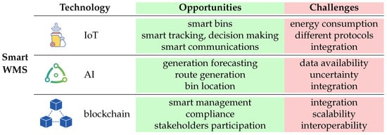 AI applications have shown potential in waste management, particularly in smart bins, waste-sorting robots, and predictive models. Additionally, the optimization of waste bin locations is critical, but often fails to consider both collection and uncertainty factors simultaneously. The implementation of local strategies and the influence of smart city policies on recycling behaviors have yielded positive results. Overall, although advanced technologies (blockchain, IoT, AI) offer revolutionary potential, they also pose challenges such as data limitations and the need for integrated approaches. To fully leverage the capabilities of smart WMS technologies, future research should focus on addressing these gaps and developing scalable, comprehensive frameworks.