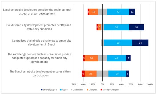 | Centralized planning is a challenge to smart city development in Saudi | 4.28 | 0.57 | 1 | Strongly Agree |