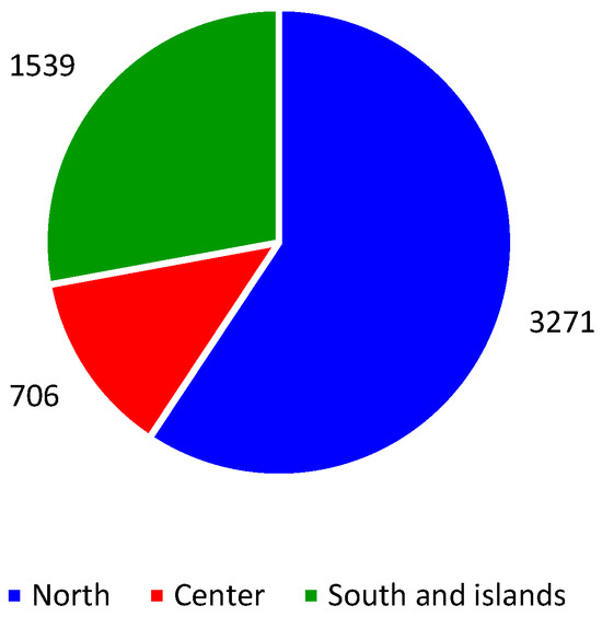 To ensure a comprehensive territorial representation, the sample includes municipalities from all three macro-areas of Italy: Northern, Central, and Southern regions (including the islands). Specifically, the sample is composed of 3271 municipalities located in Northern Italy, 706 municipalities in Central Italy, and 1539 municipalities in Southern Italy and the islands (Figure 1). This geographic distribution enables a meaningful comparison of eco-efficiency performance across diverse environmental, socio-economic, and institutional settings.