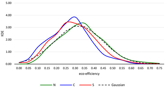 Kernel density estimation of the MSW eco-efficiency (N = North, C = Center, S = South and islands).