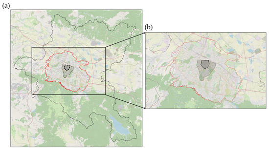Map with (a) the municipality of Sofia (black border), (b) zoomed to the city of Sofia (red border) with its LEZs—small ring (with black border and in dark grey) and large ring (with grey border and in light grey) over OSM humanitarian base map [37].