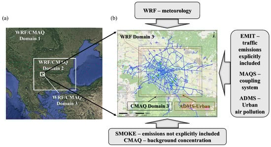 The Multi-Model Air Quality System (MAQS v. 1.2), developed and maintained by CERC, is an automated system for coupling the high-resolution ADMS-Urban with a regional air quality model with an hourly concentration output such as CMAQ [49]. Meteorological data from the WRF meso-scale model is used for both regional and the local modelling. MAQS was recently implemented for the Sofia metropolitan area [36].