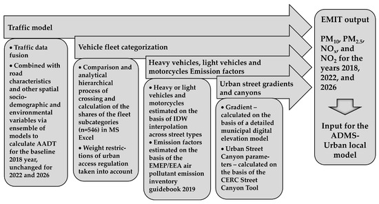 This study developed a detailed inventory of traffic emissions for Sofia along the major streets and roads, using fusion of diverse datasets based on previous experiments [35,36] with new adjustments. Emissions were calculated using the EMIT tool. The overall pathway to the inventory included several separate steps for the pre-processing and processing of the EMIT input dataset. The output from EMIT was then used as the local emission inventory input for ADMS-Urban dispersion modelling (Figure 3).